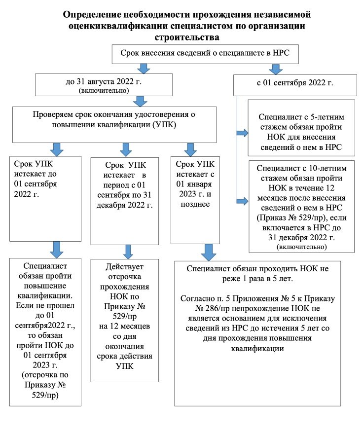 Если у физических лиц, сведения о которых включены в национальный реестр специалистов до 1 сентября 2022 года, срок повышения квалификации истекает в период с 1 сентября 2022 года по 31 декабря 2022 года, то такие лица, согласно приказу Минстроя России от 30.06.2022 г. No 529/пр «О переносе сроков прохождения независимой оценки квалификации…», обязаны пройти независимую оценку квалификации в течение одного года с момента истечения срока повышения квалификации.